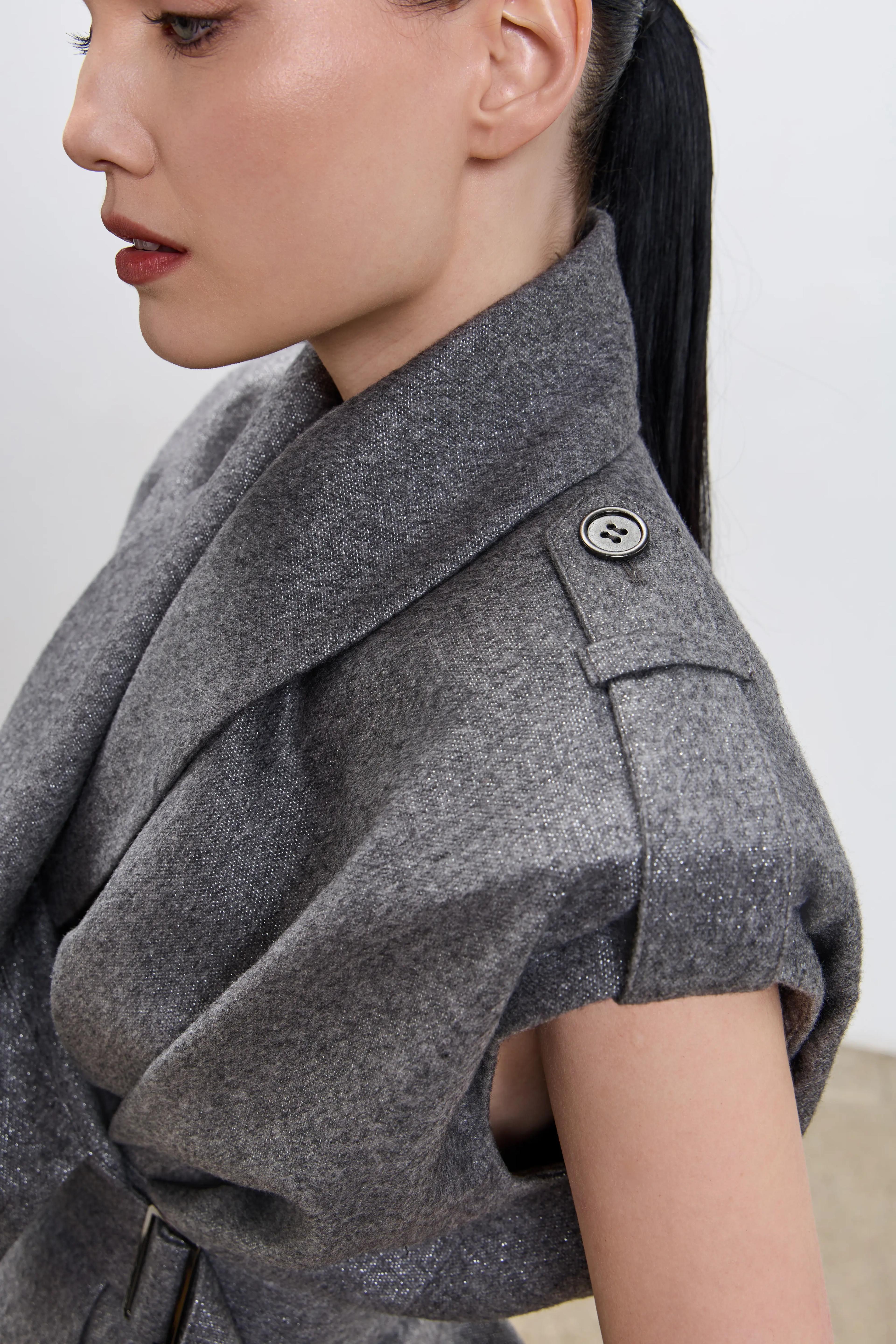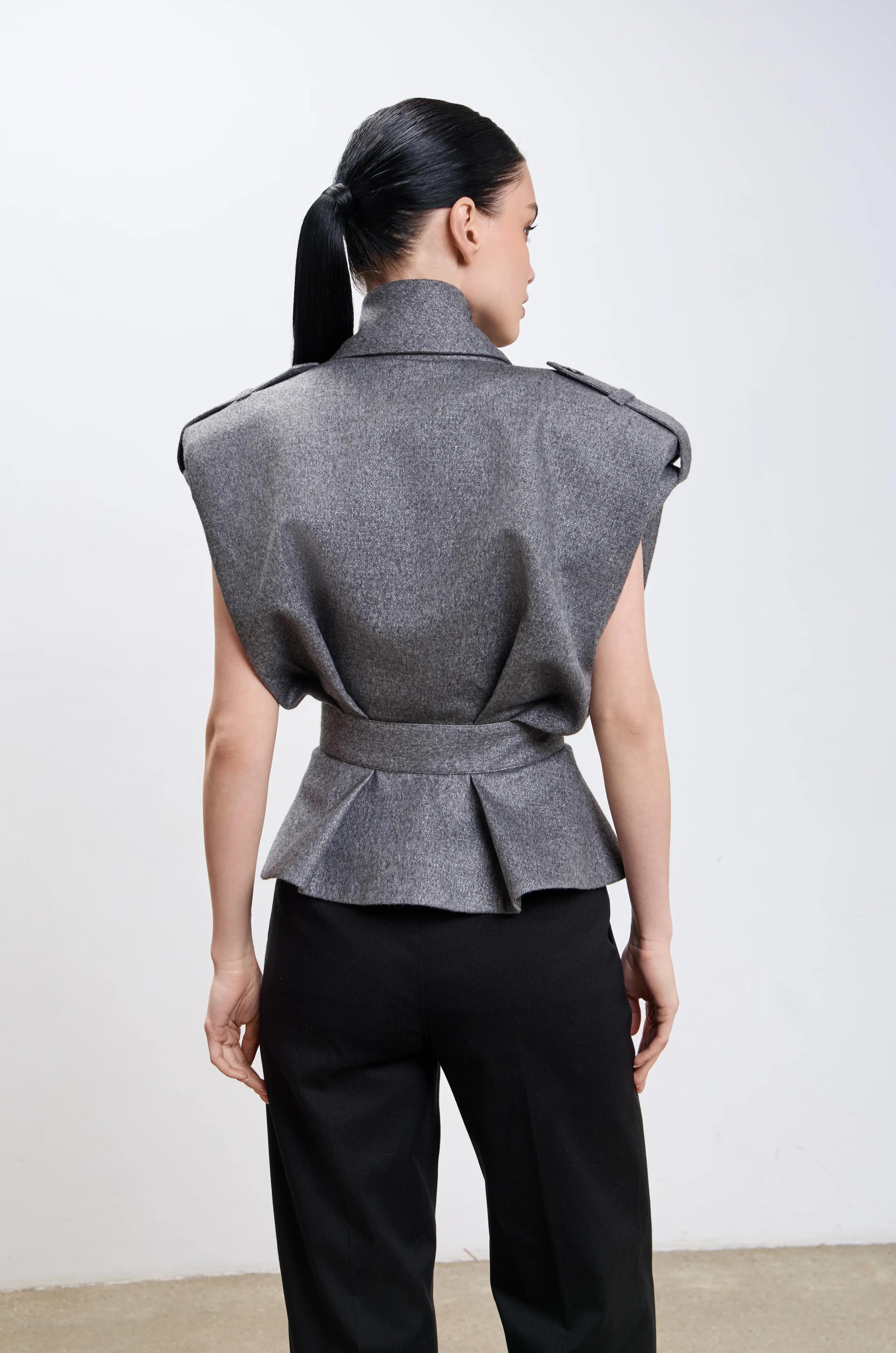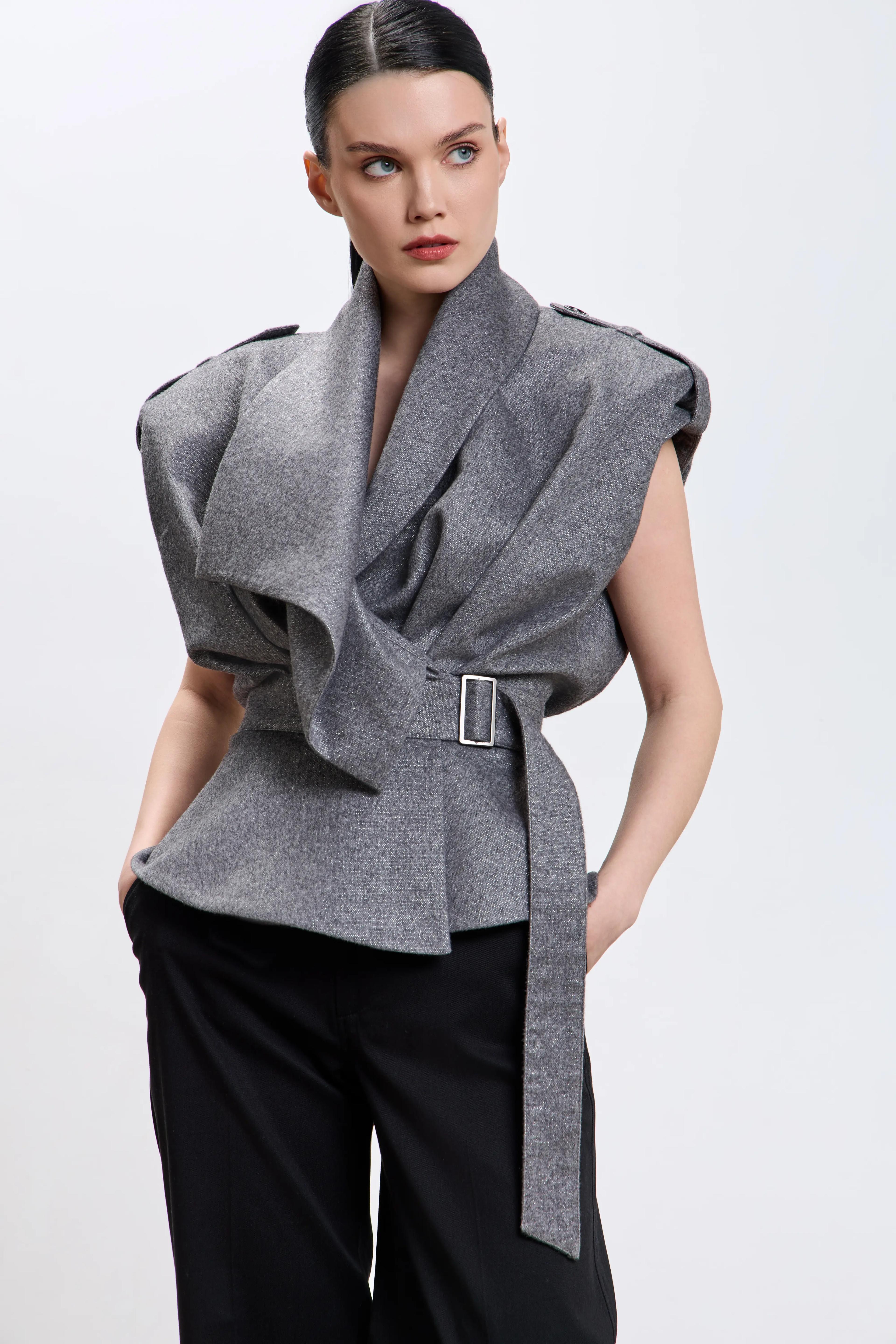 Визитная карточка бренда- жилет с объёмными плечами, выполнен из мягкого материала с кашемиром.