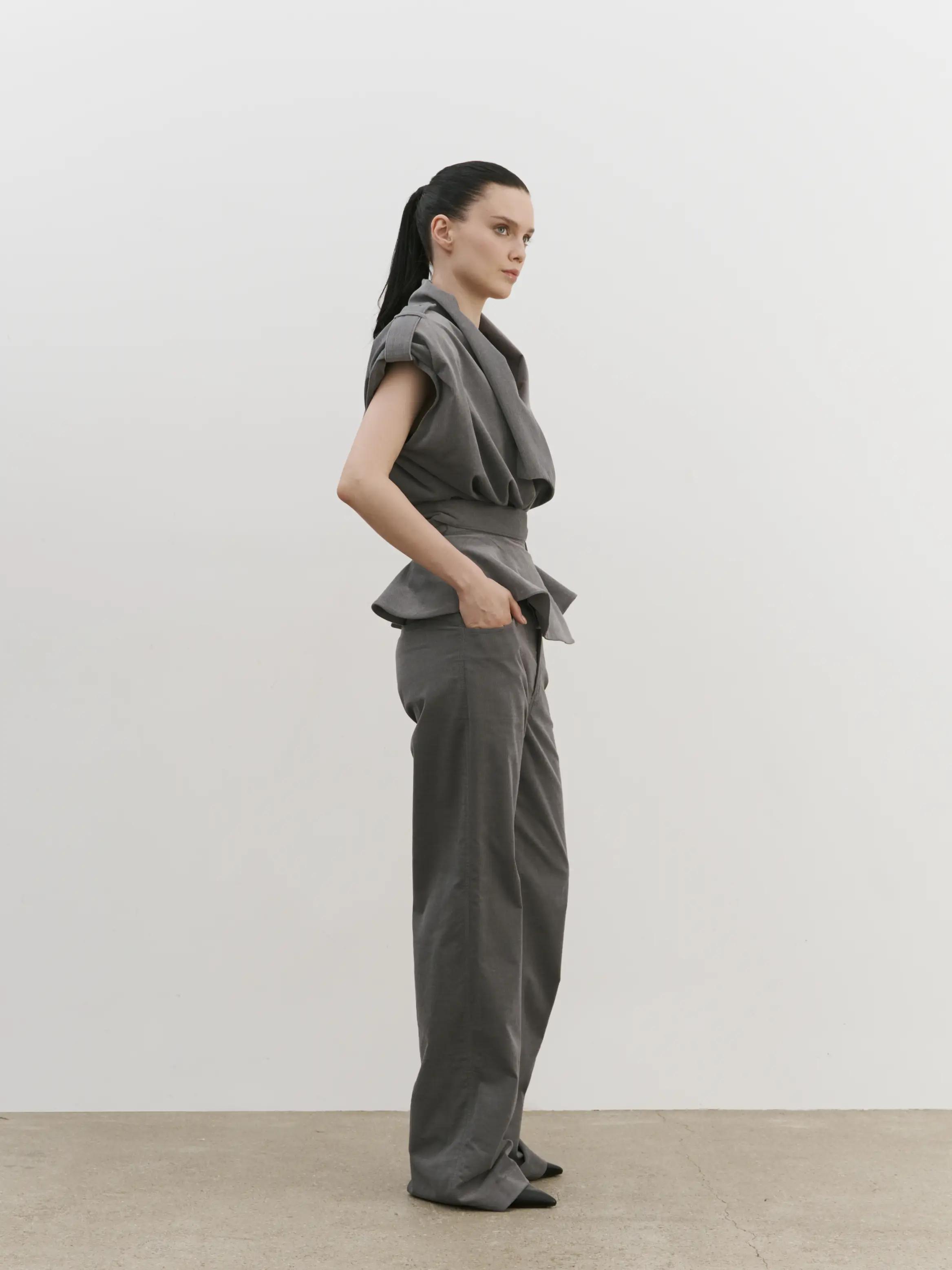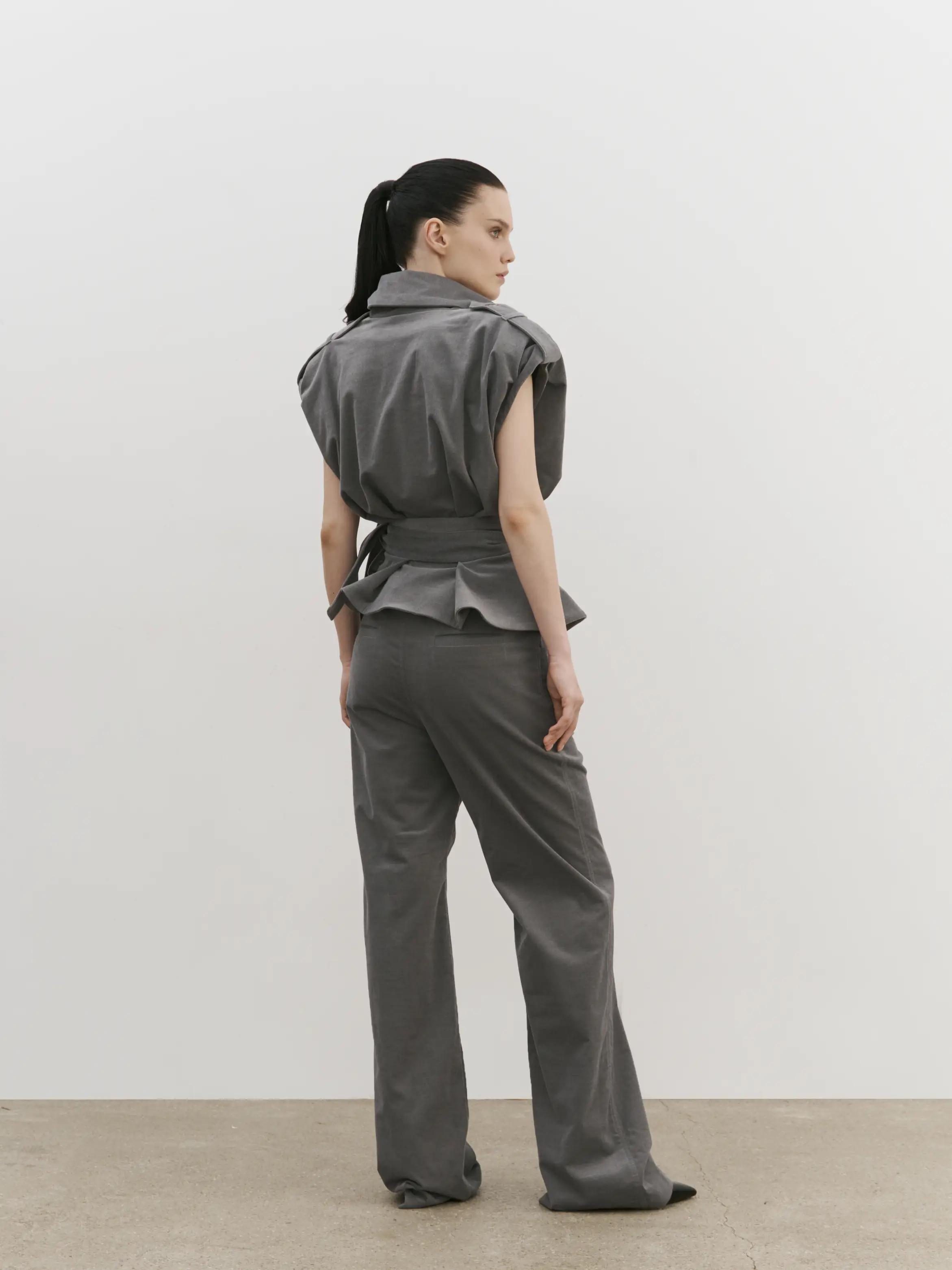 Жилет из вельветовой ткани: выполнен из натуральных материалов. Модель футуристичного дизайна- объемные плечи, баска, завязывается на талии- все эти элементы создают красивый силуэт, подчеркивают талию.