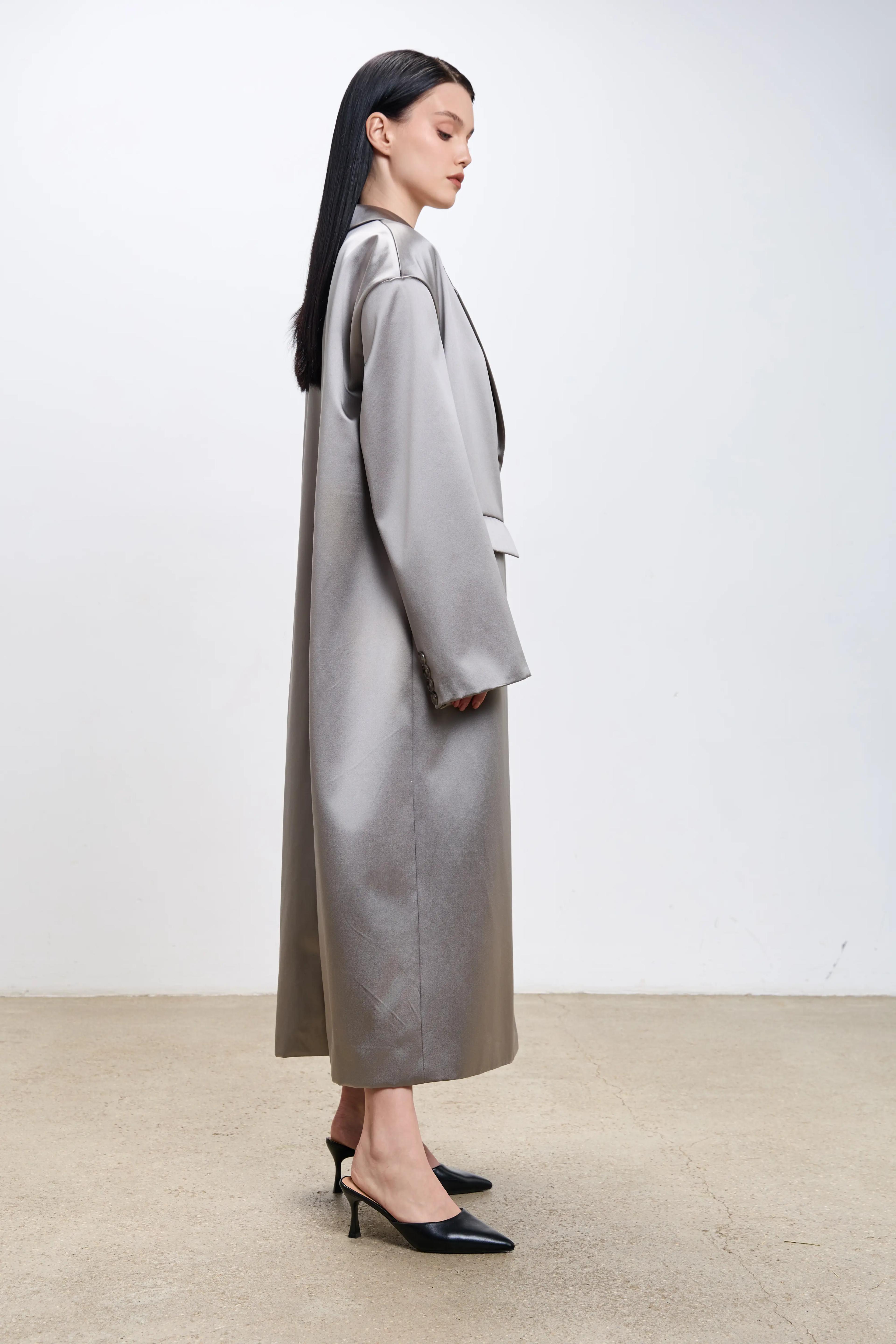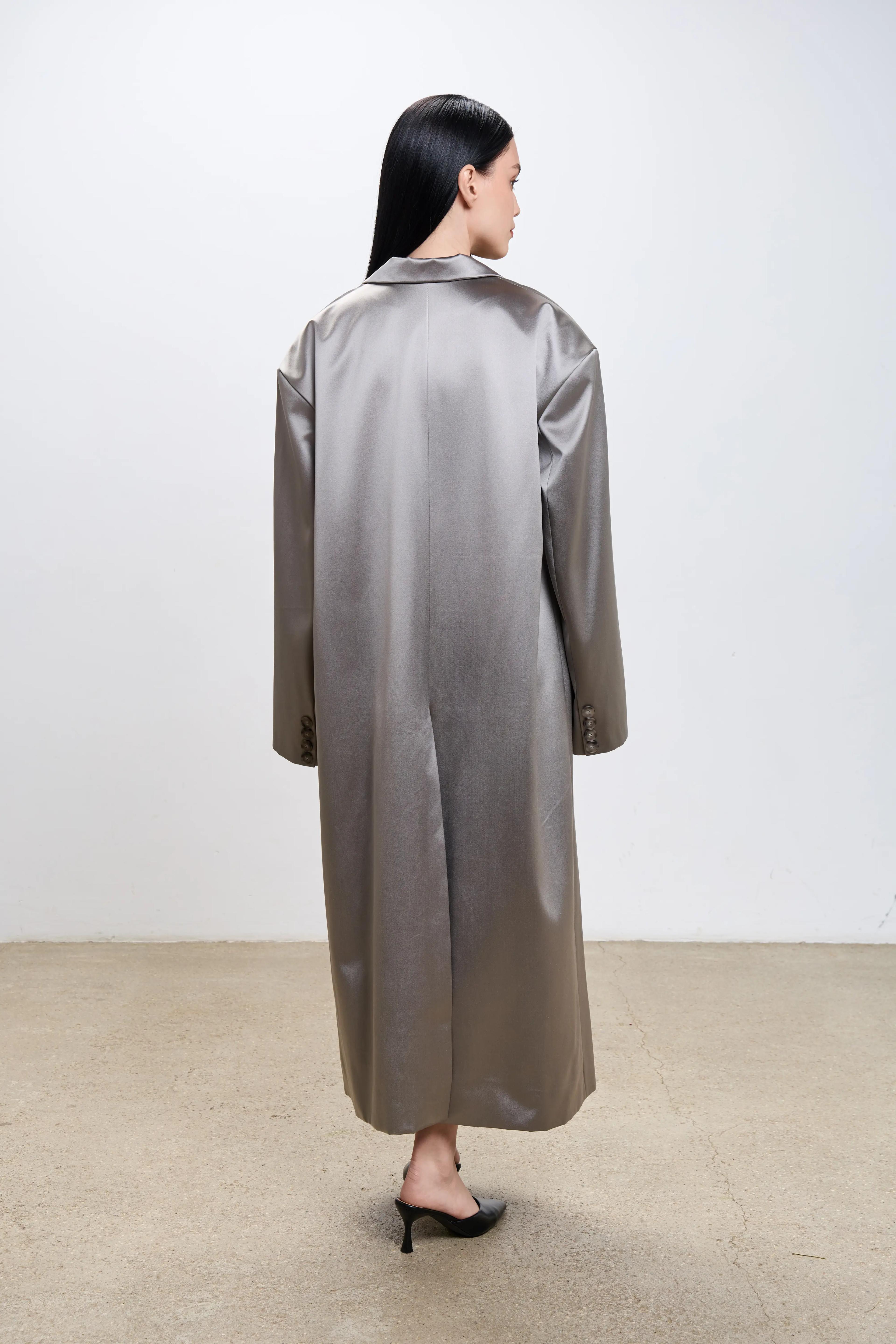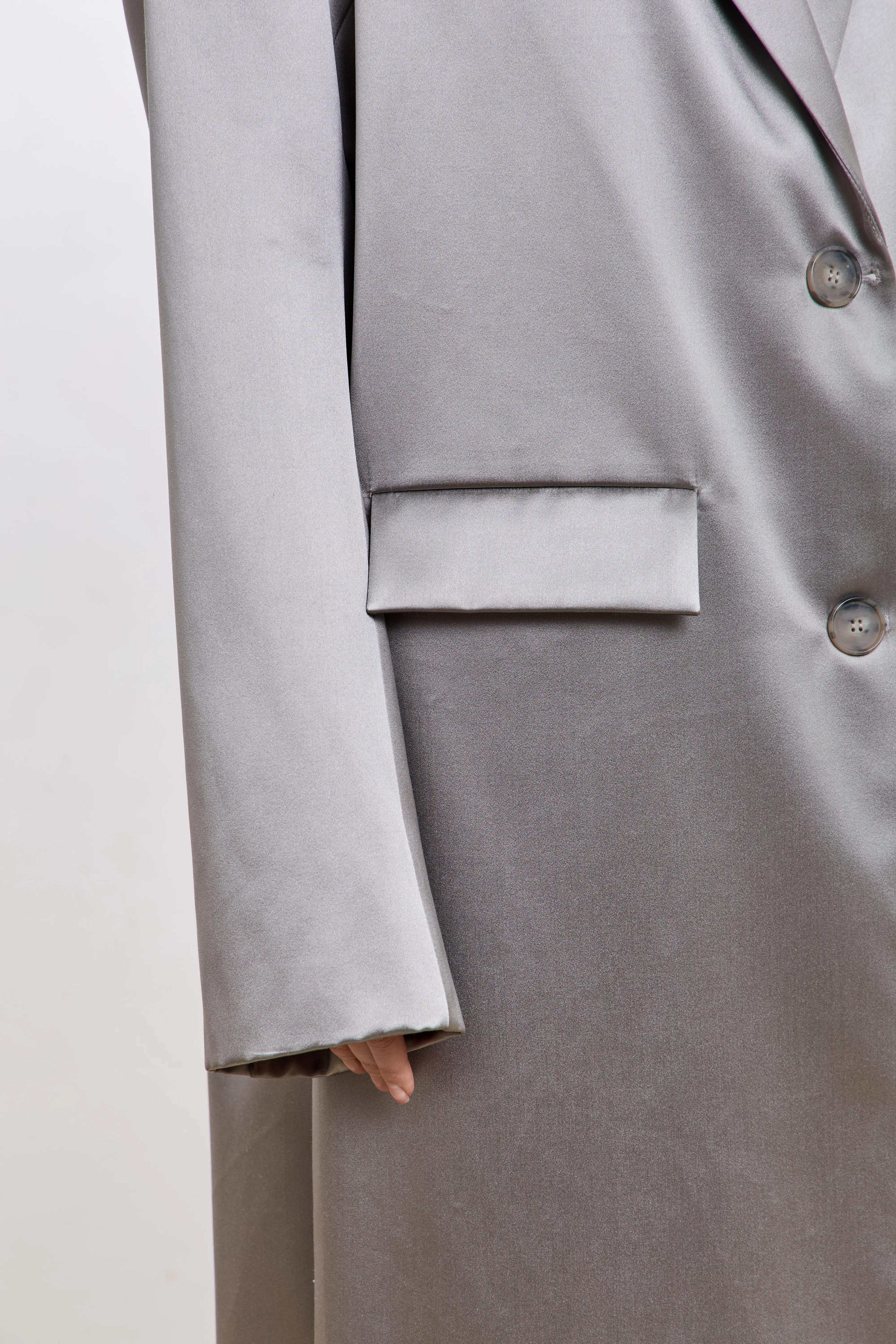 Пальто широкого мужского кроя с объемными плечами. Лаконичный воротник и минимум отделки. Длина макси, два кармана-клапана, глубокая шлица, вискозный подклад по всей длине.