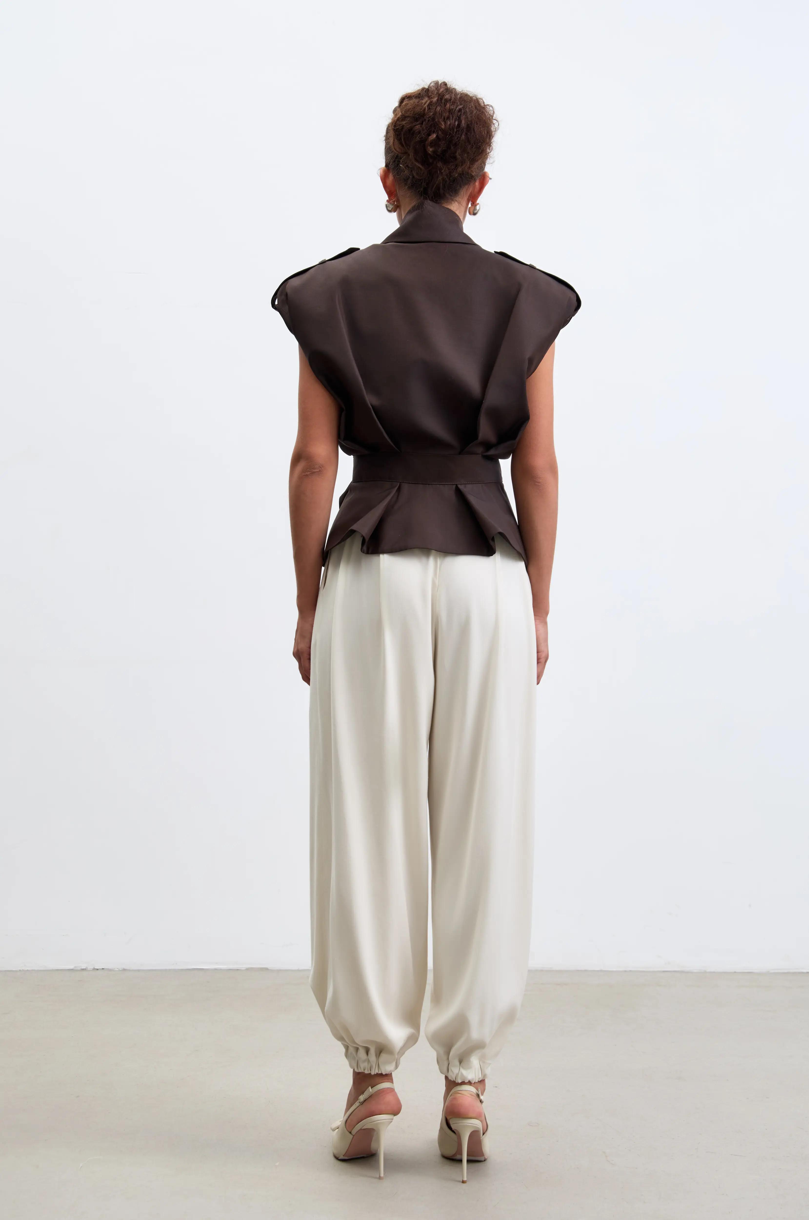 Посадка – высокая талия со слегка утягивающим, но эластичным поясом-корсажем подчёркивает линию талии. Драпировка – по две глубокие односторонние складки с каждой стороны запускают дополнительный объём от пояса, позволяя ткани свободно играть при каждом шаге. Силуэт – расслабленный по бедру и игриво сужающийся к низу ballon-крой; эластичные манжеты собирают брюки на щиколотке, визуально вытягивая фигуру и открывая обувь.