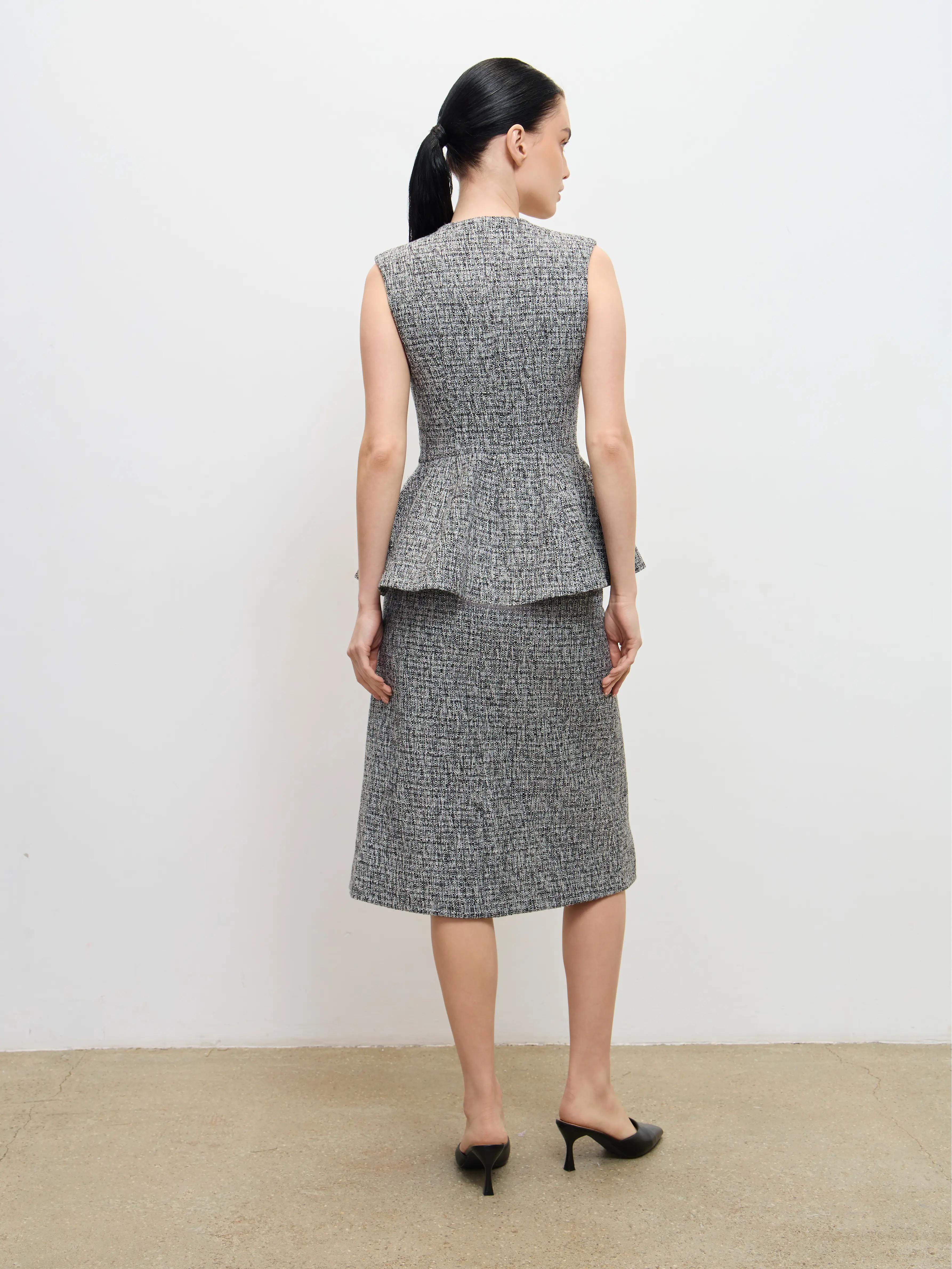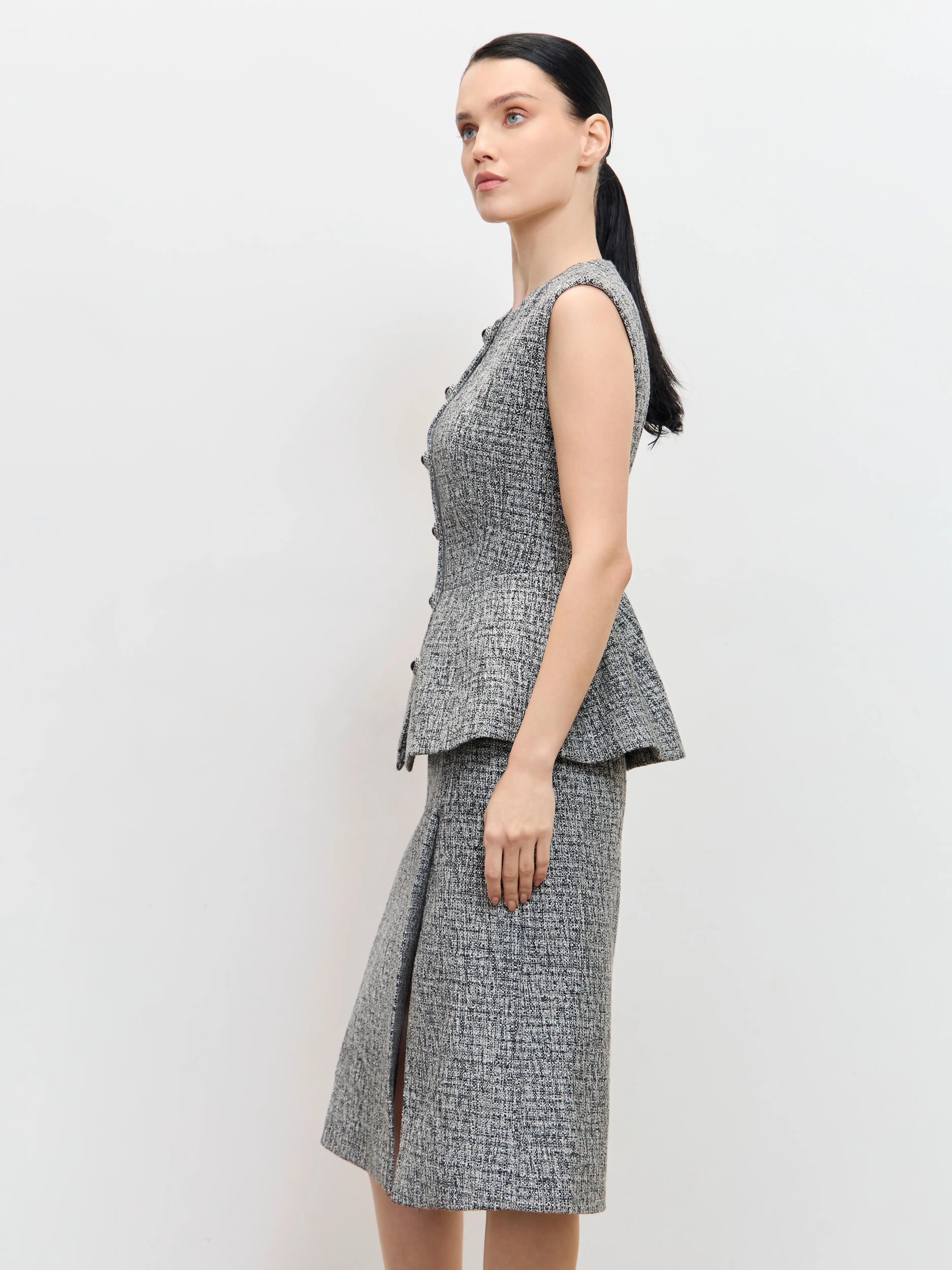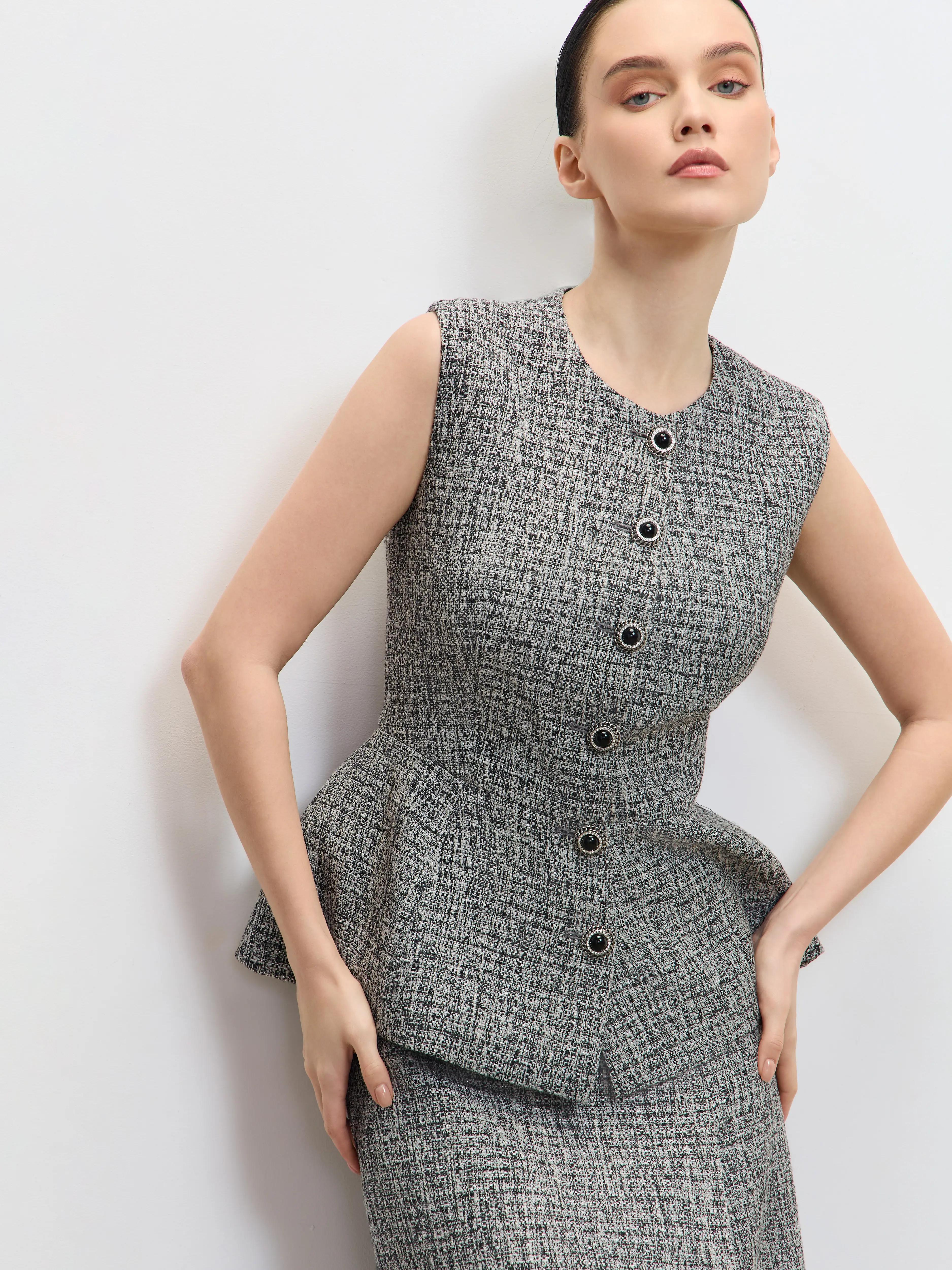 Элегантный топ с баской, на пуговицах, приталенный силуэт. Выполнен из шерстного твида, на шелковом подкладе.