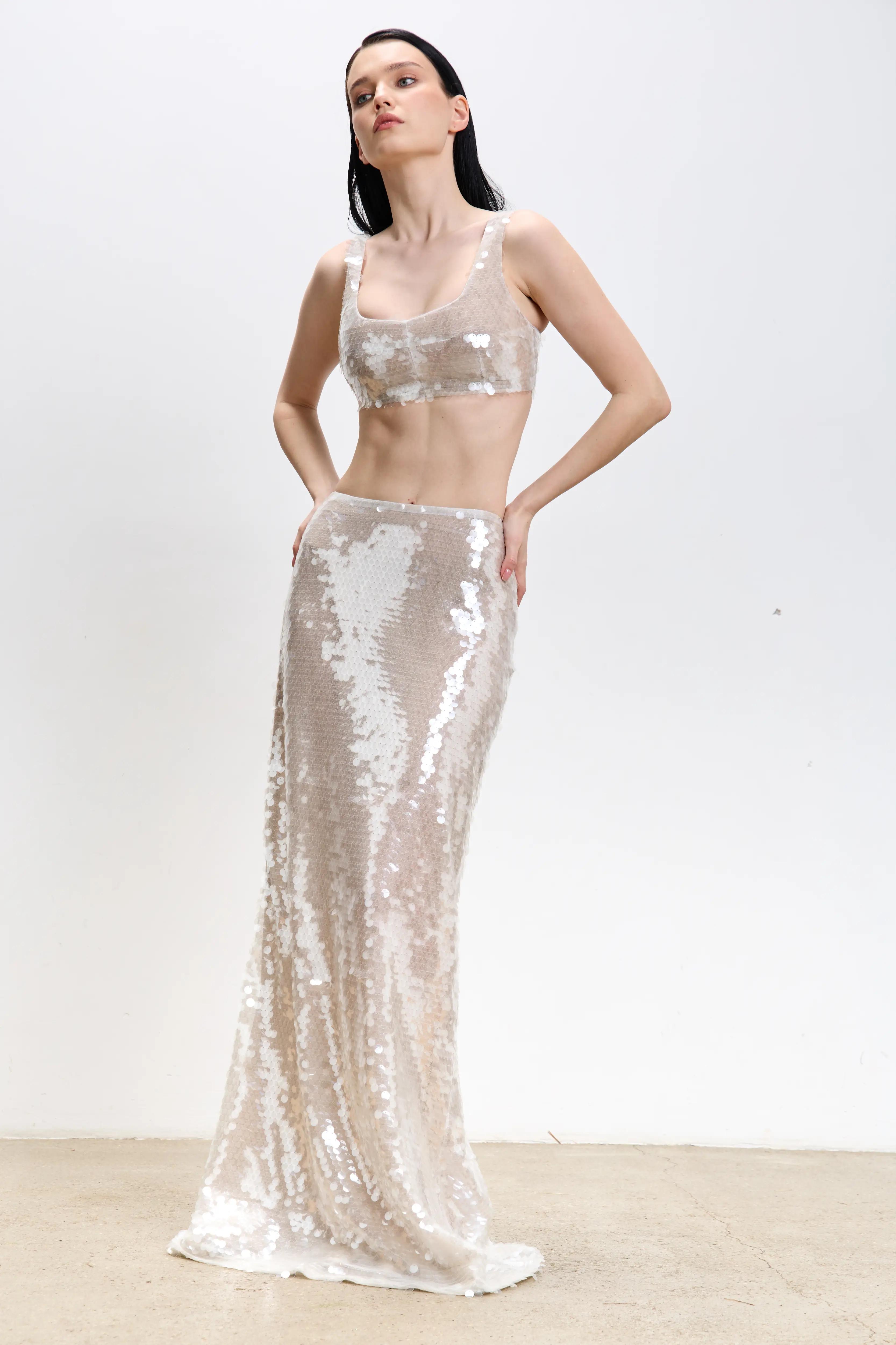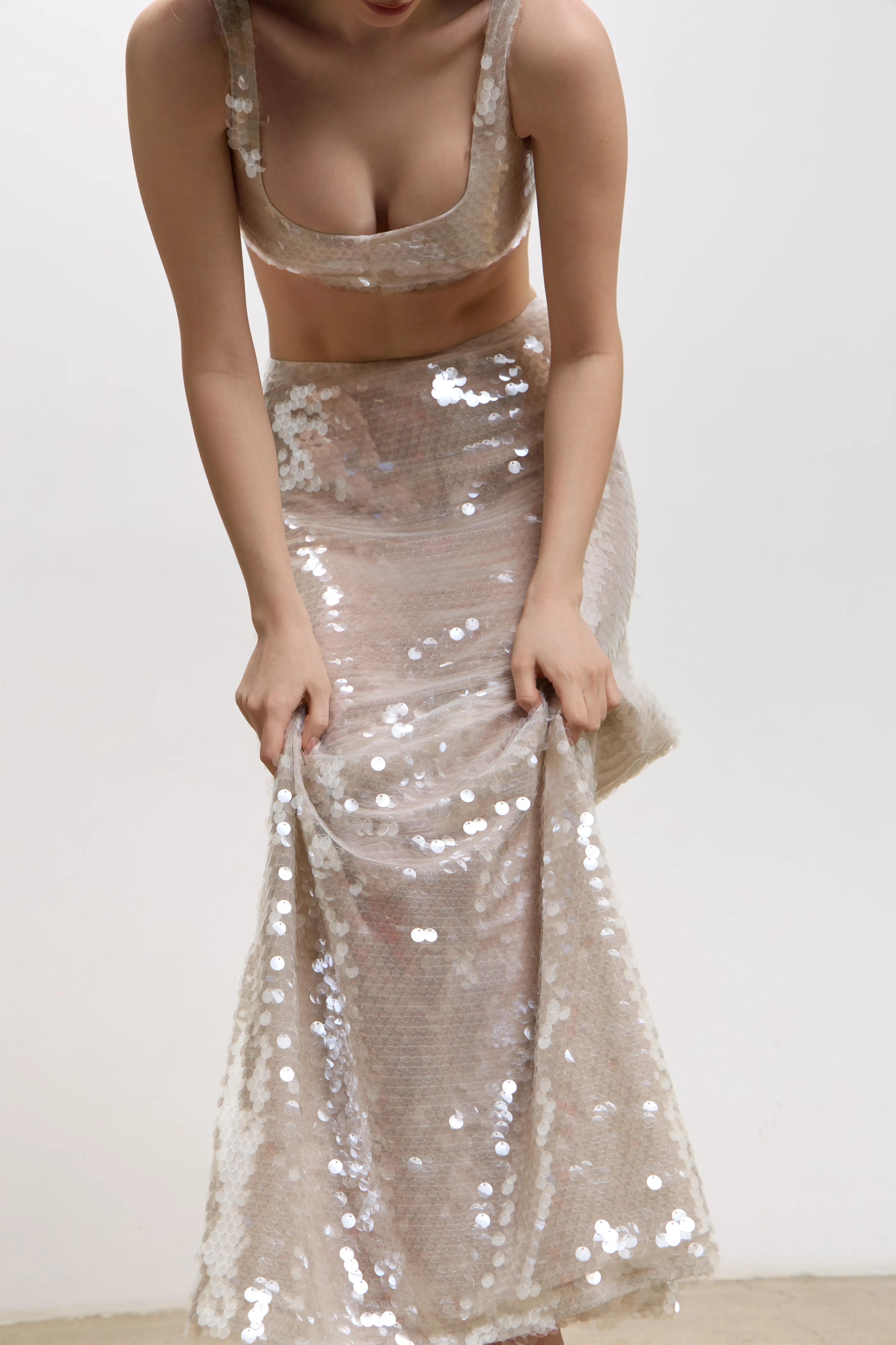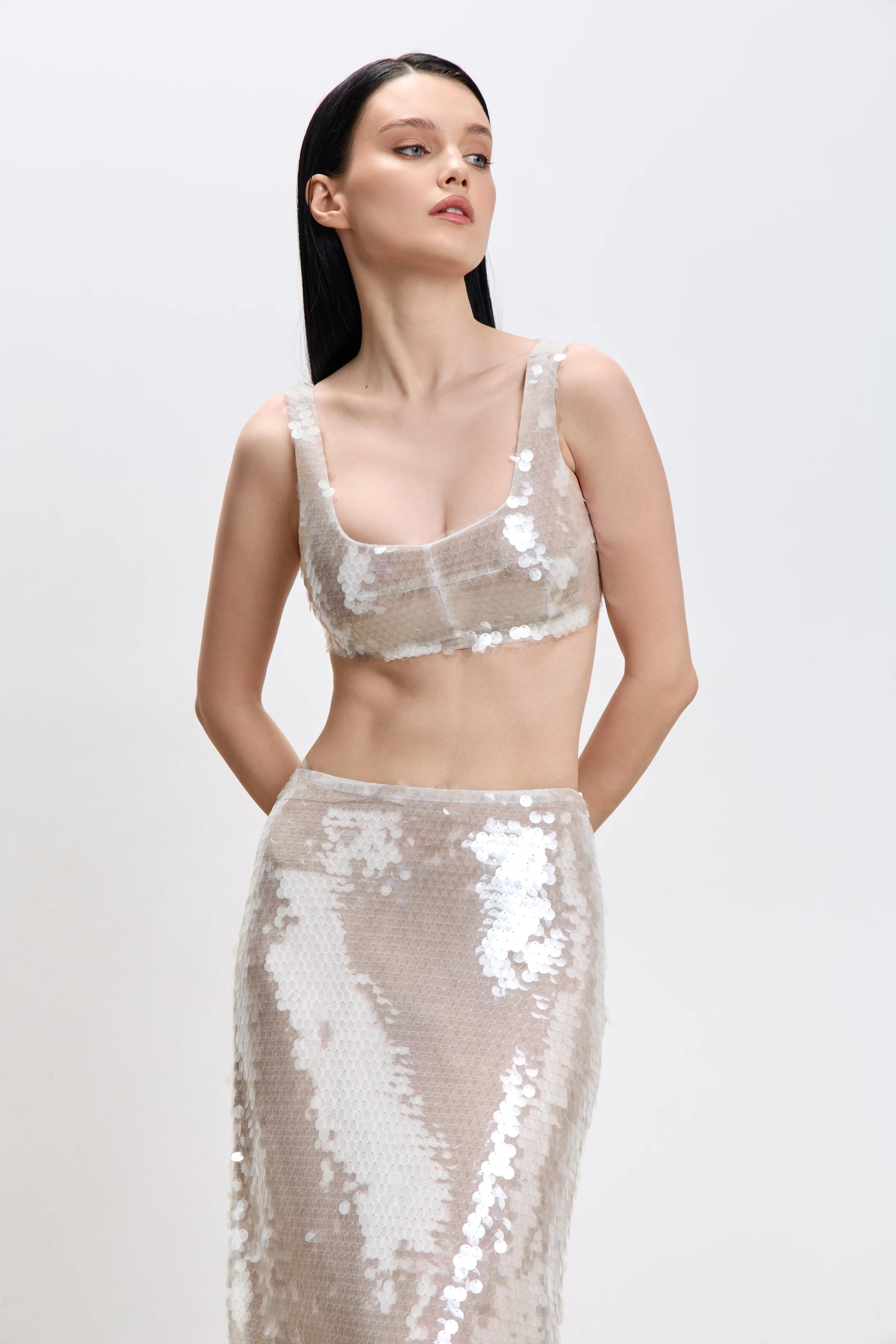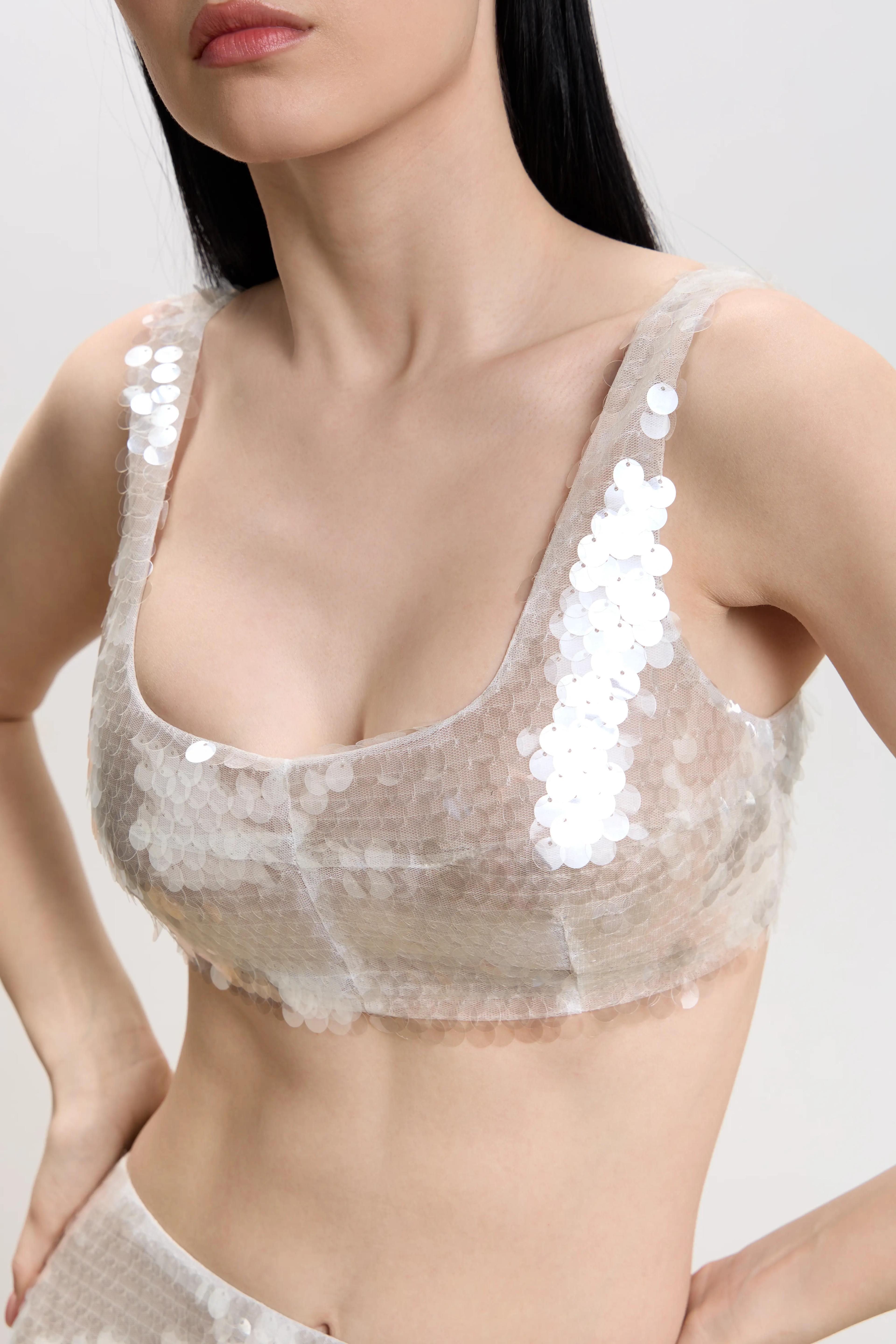 Кроп-топ из прозрачной пайетки.Хлопковый подклад по всему изделию, застежка-молния на спинке.Для total look можно сочетать топ с юбкой из прозрачной пайетки также представленной на сайте.